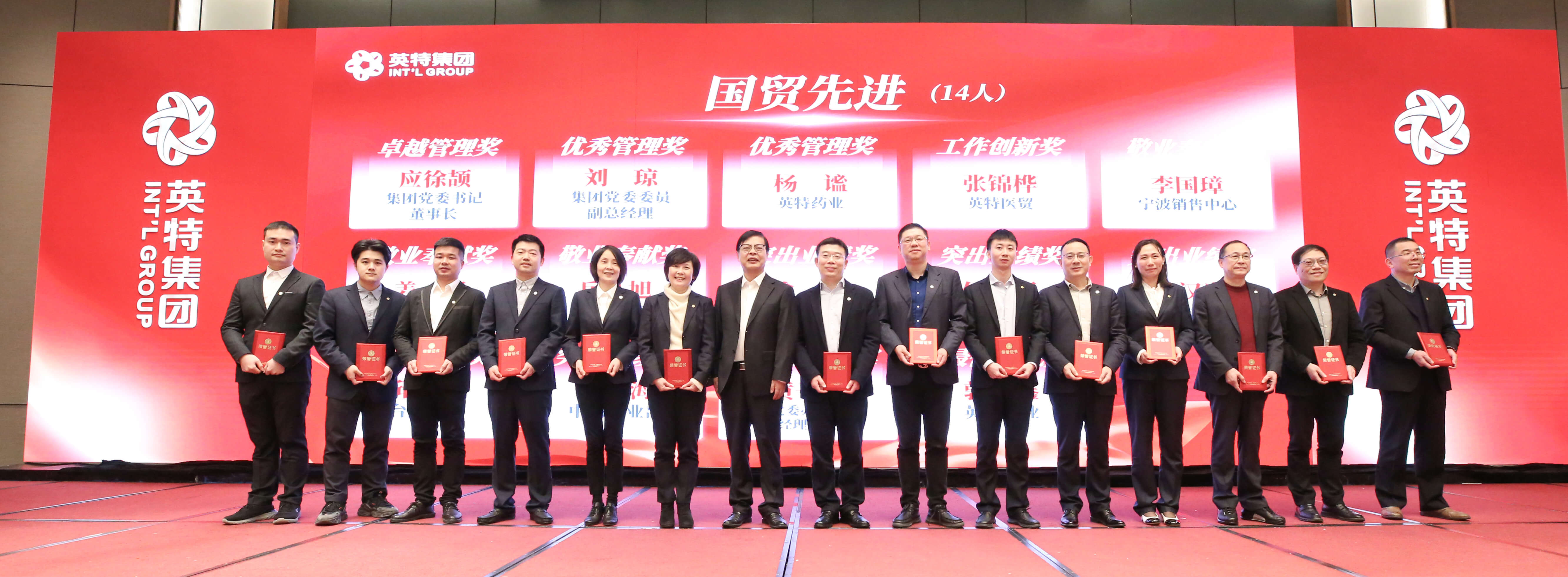 在2月10日舉行的省國貿(mào)集團(tuán)2023年度工作會議上,英特集團(tuán)榮獲省國貿(mào)集團(tuán)2022年度“先進(jìn)集體”和“爭先創(chuàng)優(yōu)行動”專項貢獻(xiàn)獎、業(yè)績貢獻(xiàn)獎二等獎等榮譽(yù);應(yīng)徐頡榮獲“卓越管理獎”,劉瓊、楊謐榮獲“優(yōu)秀管理獎”,張錦樺榮獲“工作創(chuàng)新獎”,李國璋、姜征、岳從旭榮獲“敬業(yè)奉獻(xiàn)獎”,徐進(jìn)、付紅軍、林漢光、邱陽桂、盧香海榮獲“突出業(yè)績獎”,黃子涵、郭尚鑫榮獲“最佳新銳獎”。